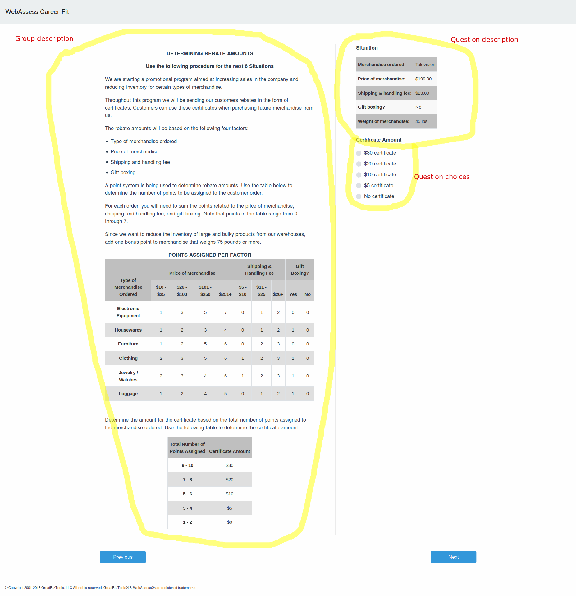 [ { "content": { "id": 161, "name": "Solving Problems P2", "description": "<p><center><strong> DETERMINING REBATE AMOUNTS<\/strong><\/p>\n<p><strong>Use the following procedure for the next 8 Situations<\/strong><\/center><\/p>\n<p>We are starting a promotional program aimed at increasing sales in the company and reducing inventory for certain types of merchandise.<\/p>\n<p>Throughout this program we will be sending our customers rebates in the form of certificates. Customers can use these certificates when purchasing future merchandise from us.<\/p>\n<p>The rebate amounts will be based on the following four factors:<\/p>\n<ul>\n<li>Type of merchandise ordered<\/li>\n<li>Price of merchandise<\/li>\n<li>Shipping and handling fee<\/li>\n<li>Gift boxing<\/li>\n<\/ul>\n<p>A point system is being used to determine rebate amounts. Use the table below to determine the number of points to be assigned to the customer order.<\/p>\n<p>For each order, you will need to sum the points related to the price of merchandise, shipping and handling fee, and gift boxing. Note that points in the table range from 0 through 7.<\/p>\n<p>Since we want to reduce the inventory of large and bulky products from our warehouses, add one bonus point to merchandise that weighs 75 pounds or more.<\/p>\n<p><center><strong>POINTS ASSIGNED PER FACTOR<\/strong><\/center>\n<center><style type=\"text\/css\">\n.tg {border-collapse:collapse;border-spacing:0;border-color:#ccc;}\n.tg td{font-family:Arial, sans-serif;font-size:14px;padding:10px 5px;border-style:solid;border-width:1px;overflow:hidden;word-break:normal;border-color:#ccc;color:#333;background-color:#fff;}\n.tg th{font-family:Arial, sans-serif;font-size:14px;font-weight:normal;padding:10px 5px;border-style:solid;border-width:1px;overflow:hidden;word-break:normal;border-color:#ccc;color:#333;background-color:#f0f0f0;}\n.tg .tg-baqh{font-weight:bold;background-color:#c0c0c0;border-color:#9b9b9b;text-align:center;vertical-align:bottom}\n.tg .tg-baqi{text-align:center;vertical-align:middle}\n.tg .tg-dzk6{background-color:#e0e0e0;border-color:#9b9b9b;font-weight:normal;border-color:#9b9b9b;text-align:center;vertical-align:bottom}\n.tg .tg-dzk7{background-color:#d0d0d0;border-color:#9b9b9b;font-weight:bold;text-align:center;vertical-align:bottom}\n@media screen and (max-width: 767px) {.tg {width: auto !important;}.tg col {width: auto !important;}.tg-wrap {overflow-x: auto;-webkit-overflow-scrolling: touch;}}<\/style>\n<div class=\"tg-wrap\"><table class=\"tg\">\n <tr><center>\n <td class=\"tg-baqh\" rowspan=\"2\"><strong>Type of<br>Merchandise<br>Ordered<\/strong><\/th>\n <td class=\"tg-baqh\" colspan=\"4\"><strong>Price of Merchandise<\/strong><\/th>\n <td class=\"tg-baqh\" colspan=\"3\"><strong>Shipping & <br>Handling Fee<\/strong><\/th>\n <td class=\"tg-baqh\" colspan=\"2\"><strong>Gift Boxing?<\/strong><\/th>\n <\/tr>\n <tr>\n <td class=\"tg-dzk7\">$10 - $25<\/td>\n <td class=\"tg-dzk7\">$26 - $100<\/td>\n <td class=\"tg-dzk7\">$101 - $250<\/td>\n <td class=\"tg-dzk7\">$251+<\/td>\n <td class=\"tg-dzk7\">$5 - $10<\/td>\n <td class=\"tg-dzk7\">$11 - $25<\/td>\n <td class=\"tg-dzk7\">$26+<\/td>\n <td class=\"tg-dzk7\"><br>Yes<\/td>\n <td class=\"tg-dzk7\"><br>No<\/td>\n <\/tr>\n <tr>\n <td class=\"tg-baqi\"><strong>Electronic Equipment<\/strong><\/td>\n <td class=\"tg-baqi\">1<\/td>\n <td class=\"tg-baqi\">3<\/td>\n <td class=\"tg-baqi\">5<\/td>\n <td class=\"tg-baqi\">7<\/td>\n <td class=\"tg-baqi\">0<\/td>\n <td class=\"tg-baqi\">1<\/td>\n <td class=\"tg-baqi\">2<\/td>\n <td class=\"tg-baqi\">0<\/td>\n <td class=\"tg-baqi\">0<\/td>\n <\/tr>\n <tr>\n <td class=\"tg-dzk6\"><strong>Housewares<\/strong><\/td>\n <td class=\"tg-dzk6\">1<\/td>\n <td class=\"tg-dzk6\">2<\/td>\n <td class=\"tg-dzk6\">3<\/td>\n <td class=\"tg-dzk6\">4<\/td>\n <td class=\"tg-dzk6\">0<\/td>\n <td class=\"tg-dzk6\">1<\/td>\n <td class=\"tg-dzk6\">2<\/td>\n <td class=\"tg-dzk6\">1<\/td>\n <td class=\"tg-dzk6\">0<\/td>\n <\/tr>\n <tr>\n <td class=\"tg-baqi\"><strong>Furniture<\/strong><\/td>\n <td class=\"tg-baqi\">1<\/td>\n <td class=\"tg-baqi\">2<\/td>\n <td class=\"tg-baqi\">5<\/td>\n <td class=\"tg-baqi\">6<\/td>\n <td class=\"tg-baqi\">0<\/td>\n <td class=\"tg-baqi\">2<\/td>\n <td class=\"tg-baqi\">3<\/td>\n <td class=\"tg-baqi\">0<\/td>\n <td class=\"tg-baqi\">0<\/td>\n <\/tr>\n <tr>\n <td class=\"tg-dzk6\"><strong>Clothing<\/strong><\/td>\n <td class=\"tg-dzk6\">2<\/td>\n <td class=\"tg-dzk6\">3<\/td>\n <td class=\"tg-dzk6\">5<\/td>\n <td class=\"tg-dzk6\">6<\/td>\n <td class=\"tg-dzk6\">1<\/td>\n <td class=\"tg-dzk6\">2<\/td>\n <td class=\"tg-dzk6\">3<\/td>\n <td class=\"tg-dzk6\">1<\/td>\n <td class=\"tg-dzk6\">0<\/td>\n <\/tr>\n <tr>\n <td class=\"tg-baqi\"><strong>Jewelry \/<br>Watches<\/strong><\/td>\n <td class=\"tg-baqi\">2<\/td>\n <td class=\"tg-baqi\">3<\/td>\n <td class=\"tg-baqi\">4<\/td>\n <td class=\"tg-baqi\">6<\/td>\n <td class=\"tg-baqi\">1<\/td>\n <td class=\"tg-baqi\">2<\/td>\n <td class=\"tg-baqi\">3<\/td>\n <td class=\"tg-baqi\">1<\/td>\n <td class=\"tg-baqi\">0<\/td>\n <\/tr>\n <tr>\n <td class=\"tg-dzk6\"><strong>Luggage<\/strong><\/td>\n <td class=\"tg-dzk6\">1<\/td>\n <td class=\"tg-dzk6\">2<\/td>\n <td class=\"tg-dzk6\">4<\/td>\n <td class=\"tg-dzk6\">5<\/td>\n <td class=\"tg-dzk6\">0<\/td>\n <td class=\"tg-dzk6\">1<\/td>\n <td class=\"tg-dzk6\">2<\/td>\n <td class=\"tg-dzk6\">1<\/td>\n <td class=\"tg-dzk6\">0<\/td>\n <\/center><\/tr>\n<\/center><\/table><\/div><\/center>\n<br>\n<br>\nDetermine the amount for the certificate based on the total number of points assigned to the merchandise ordered. Use the following table to determine the certificate amount.<\/p>\n<p><center><style type=\"text\/css\">\n.tg {border-collapse:collapse;border-spacing:0;border-color:#ccc;}\n.tg td{font-family:Arial, sans-serif;font-size:14px;padding:10px 5px;border-style:solid;border-width:1px;overflow:hidden;word-break:normal;border-color:#ccc;color:#333;background-color:#fff;}\n.tg th{font-fam