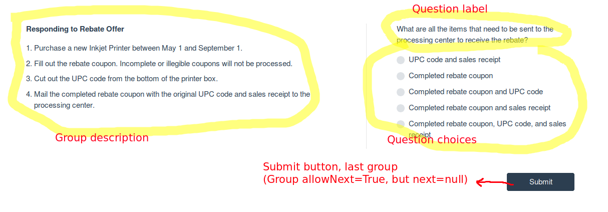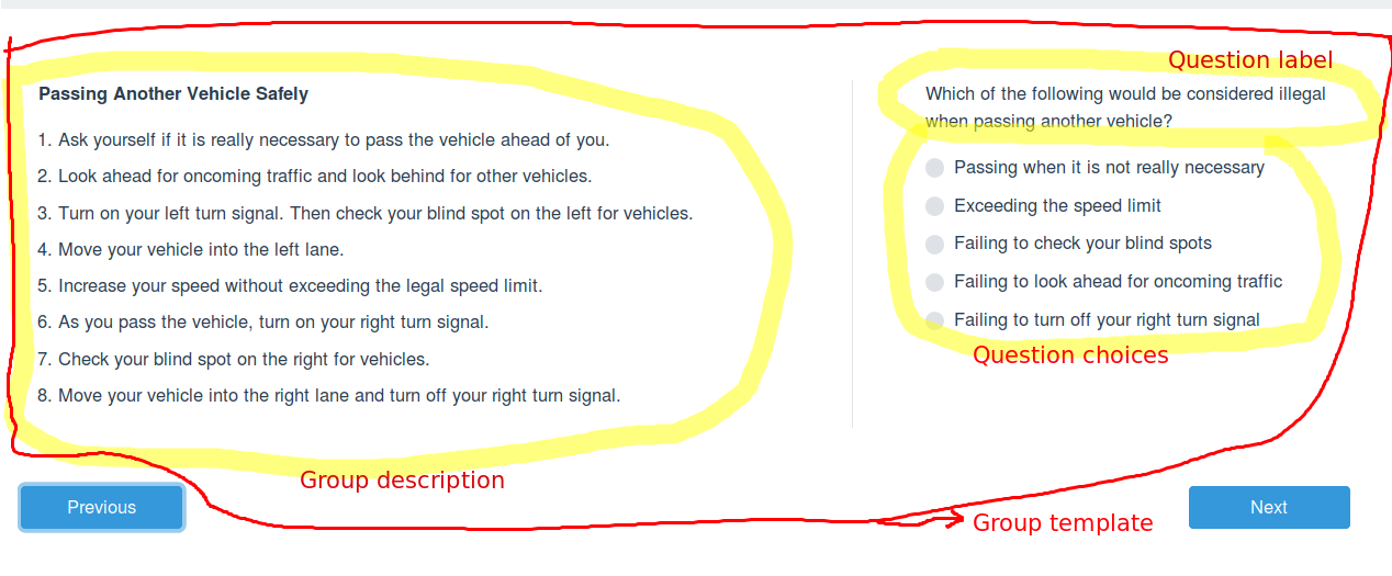 - description (string) - group description. This is information common to all questions belongig to this group. This should be displayed. See explanatory screenshot(s).